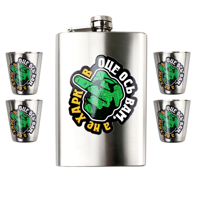 Набір ТМ 4Profi Фляга Срібло + чотири чарки + лійка, з налипкою 9oz 256 мл "Оце Ось Вам, а не Харків"