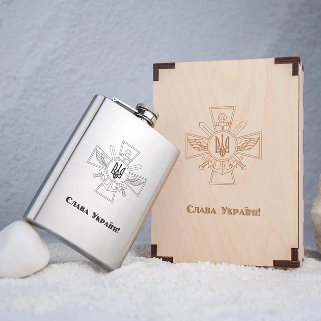Фляга кишенькова на 240 мл із гравіюванням Слава Україні, в подарунковій дерев'яній коробці, WOODPRESENT