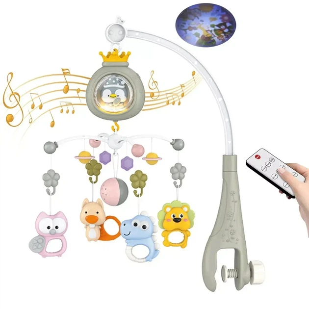 Музичний мобіль на ліжечко з проєктором і пультом керування Сірий
