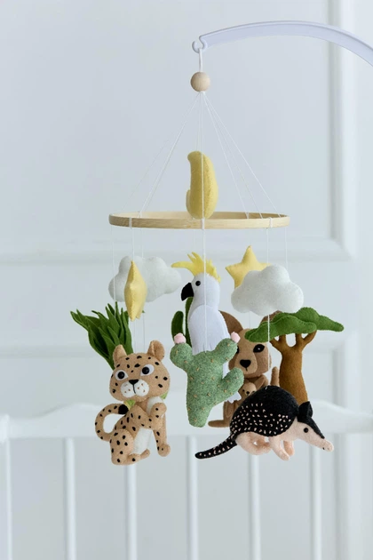 Дитячий мобіль на ліжечко WoollyFox "Друзі з далеких країв: леопард, кенгуру, крокодил, папуга та колючий друг"