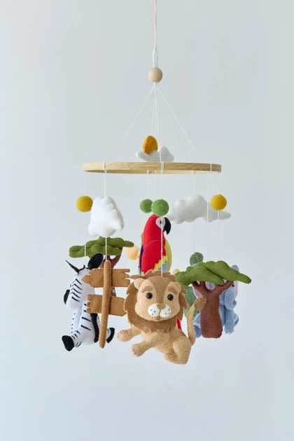 Дитячий мобіль на ліжечко WoollyFox "Теплі пригоди: слон, жирафа, папуга, лев і зебра"