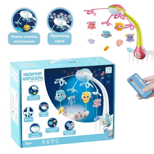 Карусель Мобіль на ліжечко "Музична карусель" 4 підвіски, пульт д/у, на ліжечко, проектор, обертання, мелодії, звуки, колиск