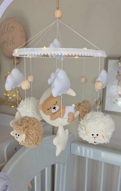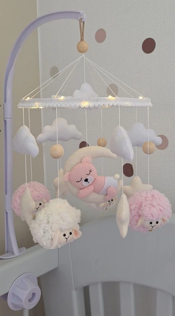 Мобіль в колиску з підсвіткою, Баранчики та Ведмедик на Місяці, молочний і пудровий, для немовлят, фетр і плюш, ручна робота
