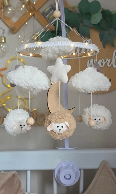 Мобіль в колиску з підсвіткою, Баранчики з Місяцем, бежевий і молочний, для немовлят, фетр, ручна робота, для хлопчика, для