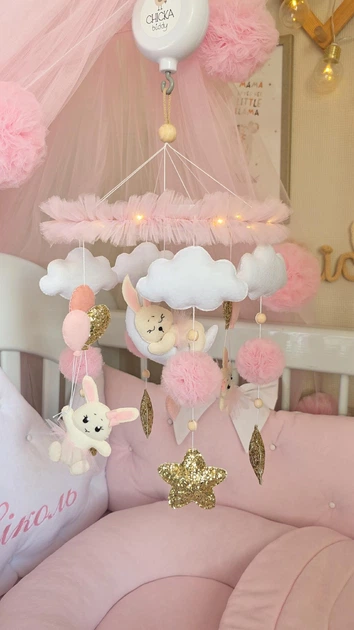 Мобіль в колиску з підсвіткою Зайчики Балерини з повітряними кульками , для немовлят, фетр, ручна робота, для дівчинки