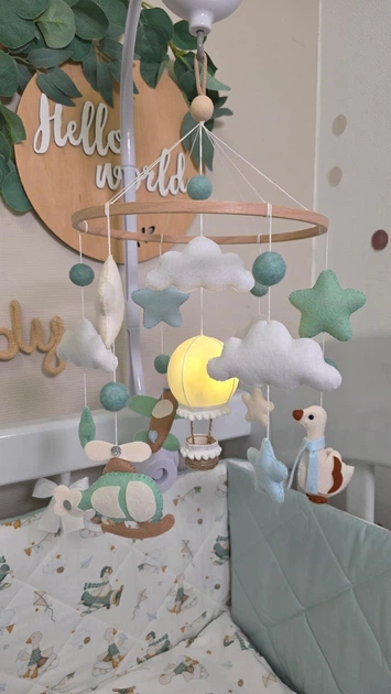 Мобіль в колиску з підсвіткою, Гусеня-пілот, м'ятний і молочний, для немовлят, плюш+фетр, ручна робота, для хлопчика, для ді