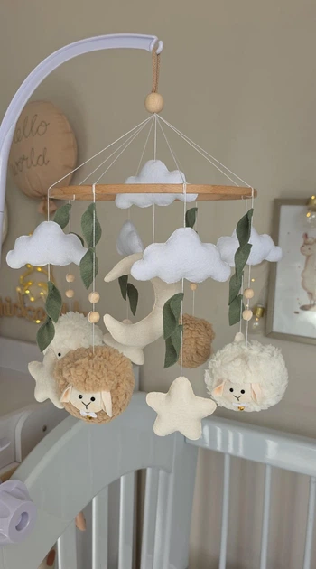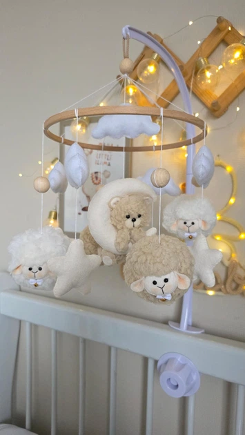 Мобіль в колиску Рахуємо Баранчиків під Місяцем, бежевий і молочний, для немовлят, фетр, ручна робота, для хлопчика, для дів