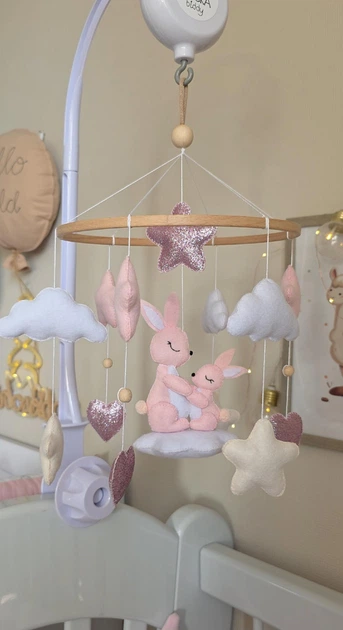 Мобіль в колиску, Зайчик з мамою рожеві, для немовлят, фетр, ручна робота, для хлопчика, для дівчинки