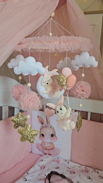 Мобіль в колиску Зайчики Балерини з повітряними кульками , для немовлят, фетр, ручна робота, для дівчинки
