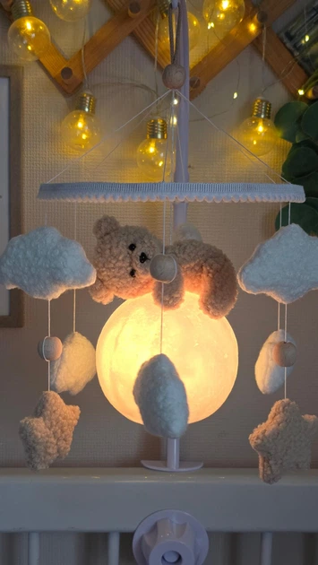 Мобіль в колиску з підсвіткою, Ведмедик Тедді на Місяці, для немовлят, фетр, ручна робота, для хлопчика, для дівчинки