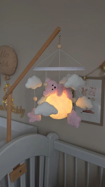 Мобіль в колиску з підсвіткою, Ведмедик на Місяці, пудровий і молочний, для немовлят, плюш, ручна робота, для хлопчика, для