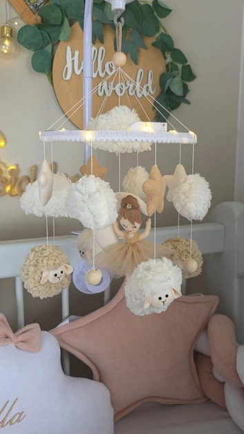 Мобіль в колиску Балерина з баранчиками, для немовлят, фетр/плюш, ручна робота, для дівчинки, з підсвіткою