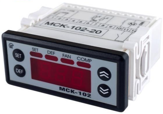 Контролер управління температурними приладами МСК-102-20 призначений для керування середньо- та низькотемпературними машинами з автоматичним відтаюванням (морозильними камерами, холодильними прилавками, моноблоками та ін.). Контролер МСК-102-20 виконує такі функції: керування компресором для підтримки заданої температури морозильної камери; контроль температури морозильної