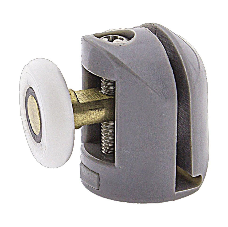 Ролик для душевых кабин и гидробоксов верхний и нижний, одинарный, пластиковый диаметром колеса 22 мм. Ролики имеет эксцентриковую систему регулировки, пластиковые посадочные детали, зажимается гайкой и закрывается колпачком. Колесо с подшипником завальцовывается на штоке. Материал штока – нержавеющая сталь или латунь. Колесо имеет подшипник с металлическими шайбами и