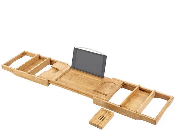 Столик полиця для ванної з підставкою для келиха Столик для ванни знімить навантаження, забезпечить спокій. Повний релакс, подібно до спа. Ви можете стильно поринути у ванну, переглядаючи фільми на своєму планшеті та потягуючи вино. Розкладний столик полиця для ванної кімнати з висувними сторонами був розроблений таким чином, щоб відповідати навіть найширшій ванній