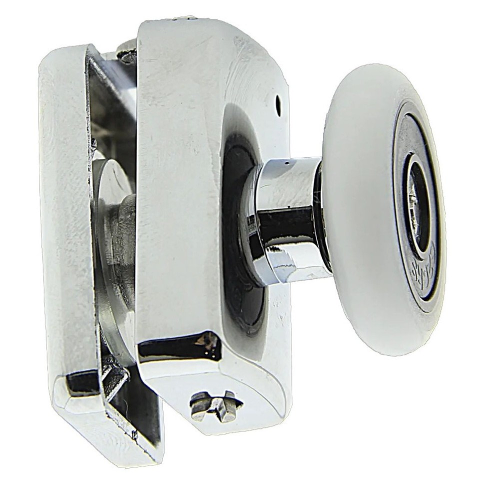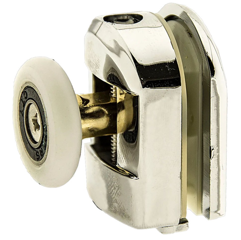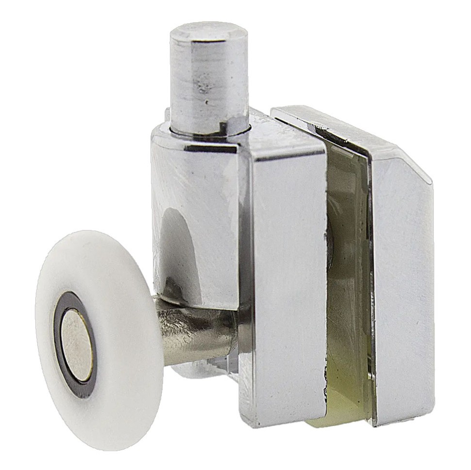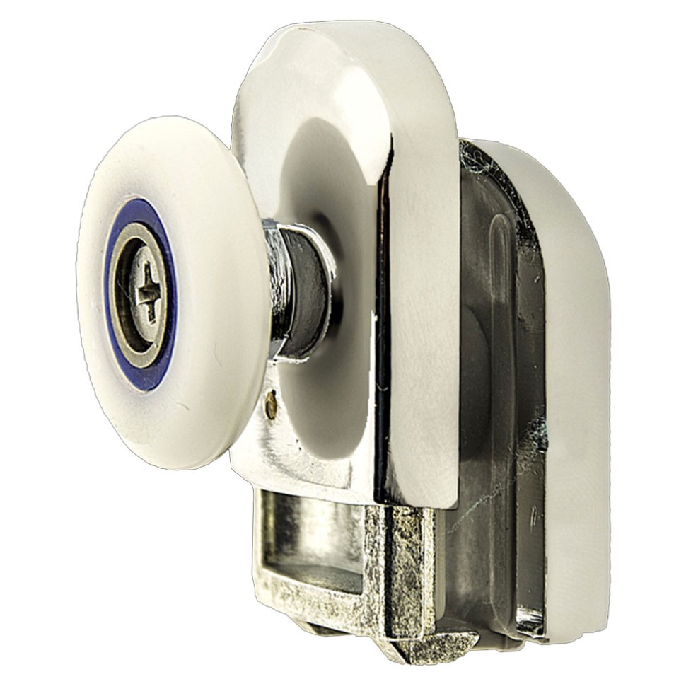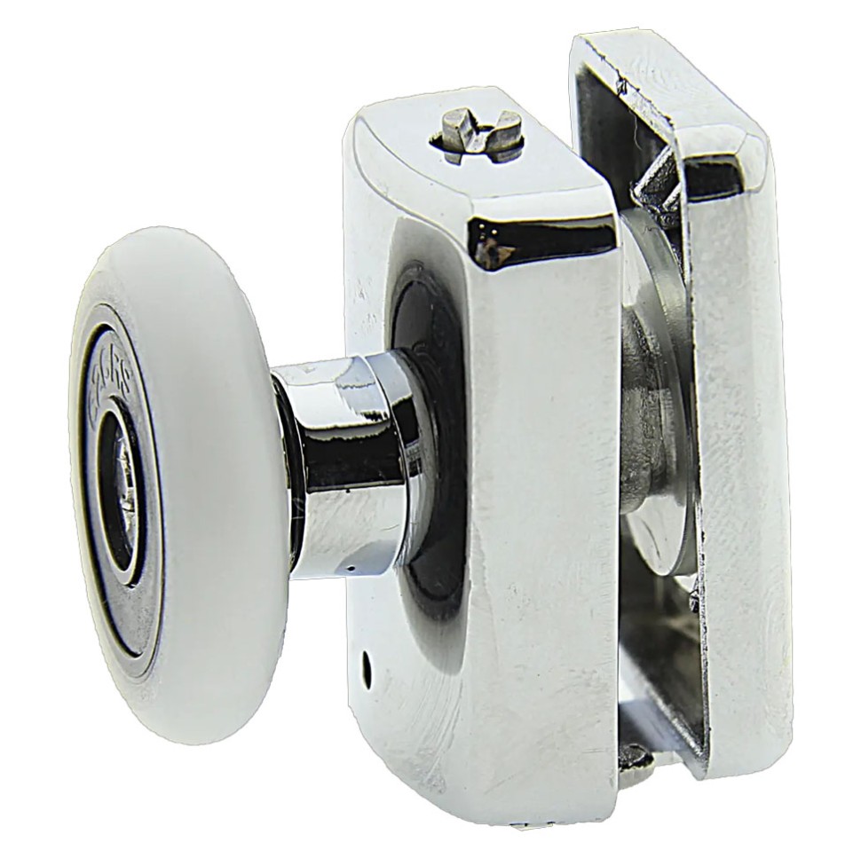 Ролик В-902 (верхній, одинарний, поворотний, не натискається) для душової кабіни. З діаметром коліс 19, 23, 26, 28 мм. Ставиться у верхній частині скла. Задня частина ролика закривається декоративним хромованим ковпачком. Корпус пластиковий, поворотне колесо, металеві деталі виготовлені з нержавіючих матеріалів. Посадкові деталі виготовлені з пластику, що запобігатиме пошкодженню