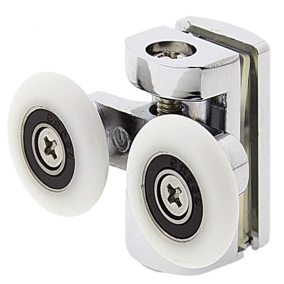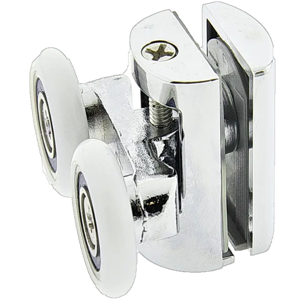 Ролик душової кабіни подвійний, що регулюється, ставиться у верхній частині скла. Задня частина ролика закривається хромованим ковпачком. Корпус пластиковий, поворотний, вагонка із колесами кріпиться до корпусу ролика регулювальним болтом. Знімне колесо кріпиться до вагонетки болтом. Посадкові деталі виготовлені із пластику, що запобігає пошкодженню скла під час