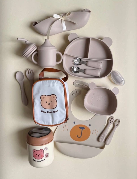 Набір силиконового посуду для дітей на 12 предметів із якісного, безпечного та харчового силикону + Іграшка Монтессорі