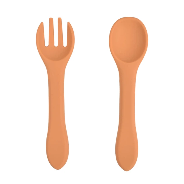 Прилади силіконові дитячі ложка та вилка з дерев'яною ручкой Персикові PRD-Y12