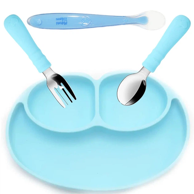 Силіконовий посуд 2Life тарілка на три секції Y21 Y10 ложка для першого прикорму Синій n-12812