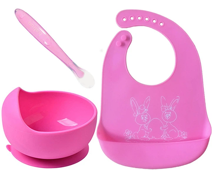 Набір силіконового посуду 2Life тарілка для перших страв ложка слинявка стрічка-тримач Рожевий n-12627