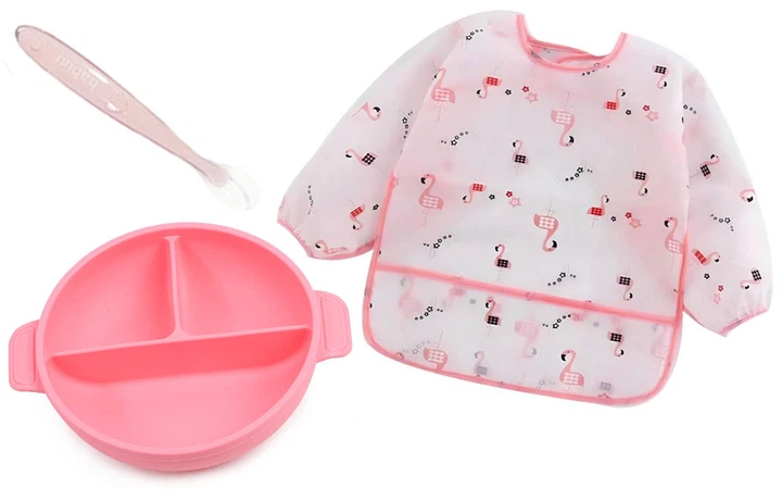Набір посуду 2Life Трисекційна глибока тарілка Y14 ложка та слинявчик-нагрудник з фламінго Рожевий n-12891
