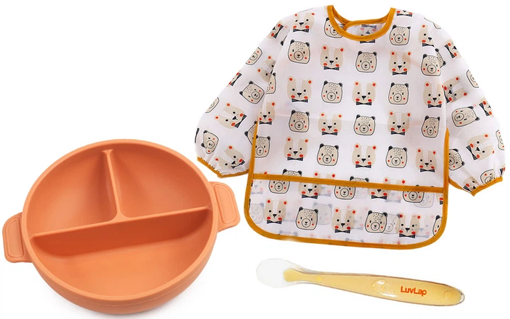 Набір посуду 2Life Трисекційна глибока тарілка Y25 ложка та слинявчик-нагрудник з ведмедиками Помаранчевий v-12890