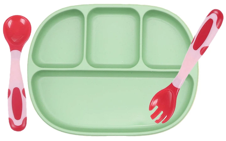 Набір Чотирисекційна силіконова тарілка Зелений та Термочутлива ложка-вилка Рожевий (vol-10243)