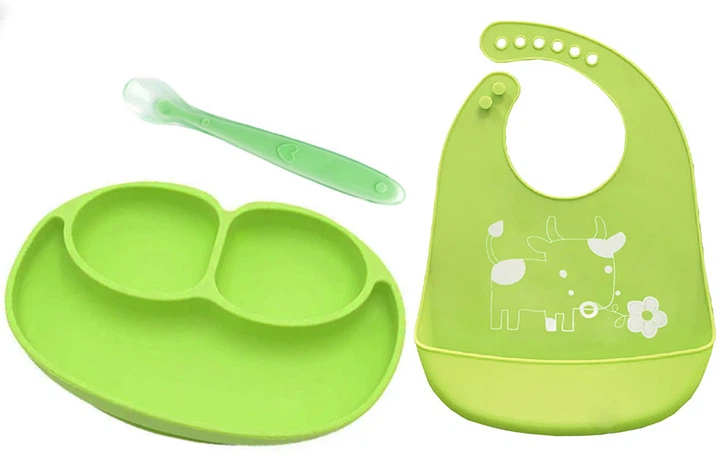 Набір силіконового посуду 2Life тарілка килимок ложка і слинявка з малюнком корівки Зелений n-12830