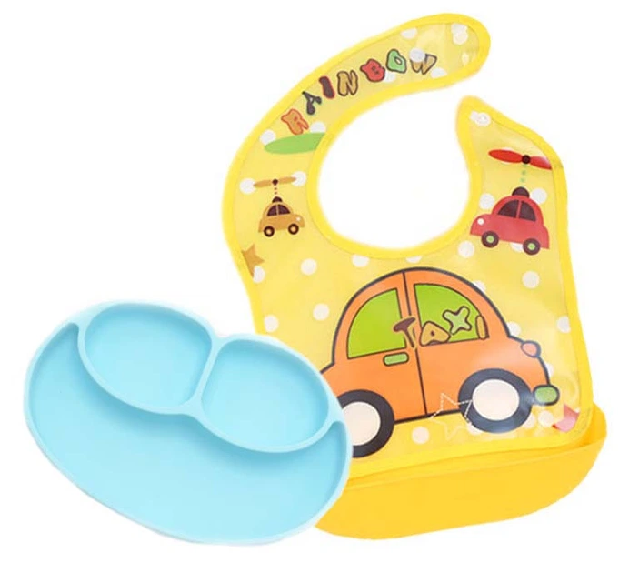 Набір силіконова тарілка килимок для годування дитини 22х15 см Блакитний і слюнявчик ПВХ (n-1075)