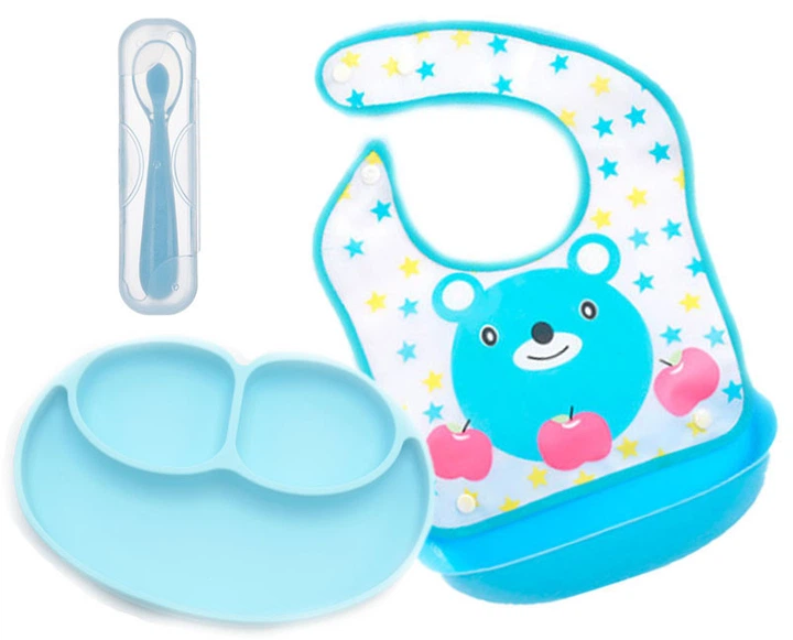 Набір силіконова тарілка килимок, слинявчик з ПВХ Блакитний і Силіконова ергономічна ложка (n-1097)