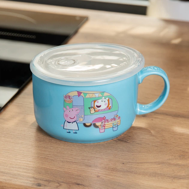 Миска для локшини Summer Time блакитний 770 мл керамічна з герметичною кришкою та ручкою бульйонниця з персонажем Свинка Пеп