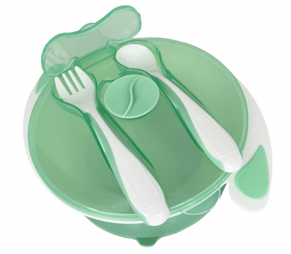 Дитяча тарілка на присосці з двома приладами та кришкою для першого прикорму 300 мл Mumlove Зелений