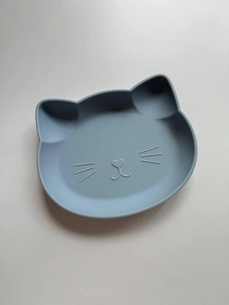 Плоска дитяча тарілка силіконова на присосці без секцій котик Блакитний