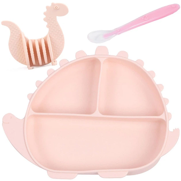 Набір дитячого силіконового посуду 2Life Y4 для першого прикорму з іграшкою-прорізувачем Динозавр Рожевий v-13387
