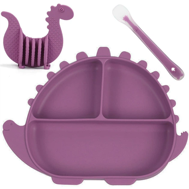 Набір дитячого силіконового посуду 2Life Y19 для першого прикорму та прорізувач-іграшка Динозавр Бузковий v-13392