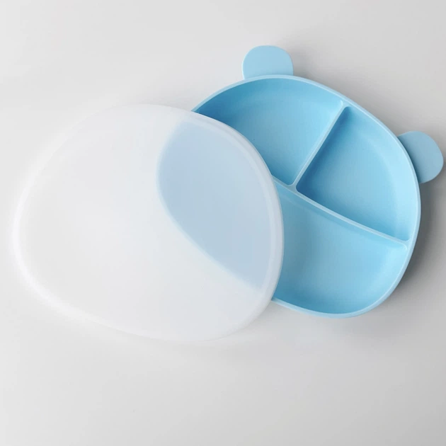 Дитяча силіконова секційна тарілка з кришкою на присосці для першого прикорму, 1 шт. Сіро-блакитний