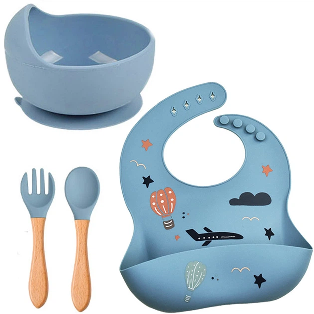 Набір силіконового посуду 2Life Y21 миска для супу ложка вилка та слинявчик з принтом Блакитний n-12993