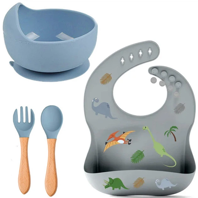 Набір силіконового посуду 2Life Y18 глибока тарілка ложка вилка та слинявчик з принтом Сірий v-12990