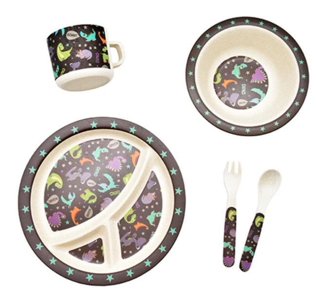 Посуд дитячий бамбук "Динозаврі" 5пр/наб (2тарілки, вилка, ложка, чашка)
