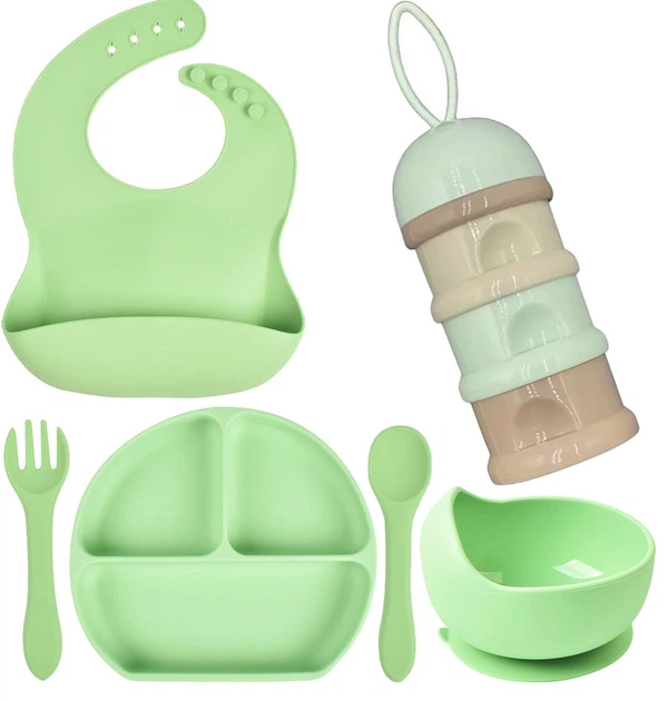 НабірY3сіліконової тарілки, слиньчик, тарілка глибока, ложка, вилка, контейнер-снеки Зелений (n-9833)