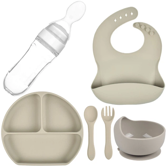 НабірY20силіконова тарілка, слинявчик, тарілка для перших страв, ложка,вилка, пляшка-ложкаКремовий (vol-9928)