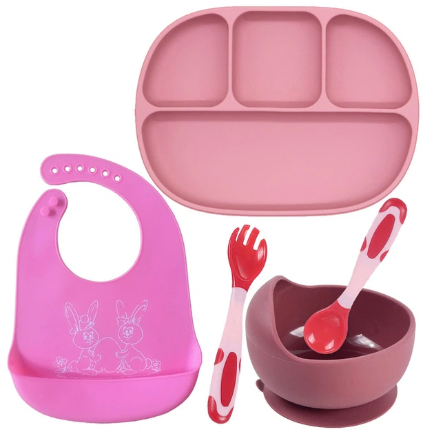 Набір силіконового посуду 2Life тарілка D5 слюнявчик Зайки термочутливі прибори і супниця Y16