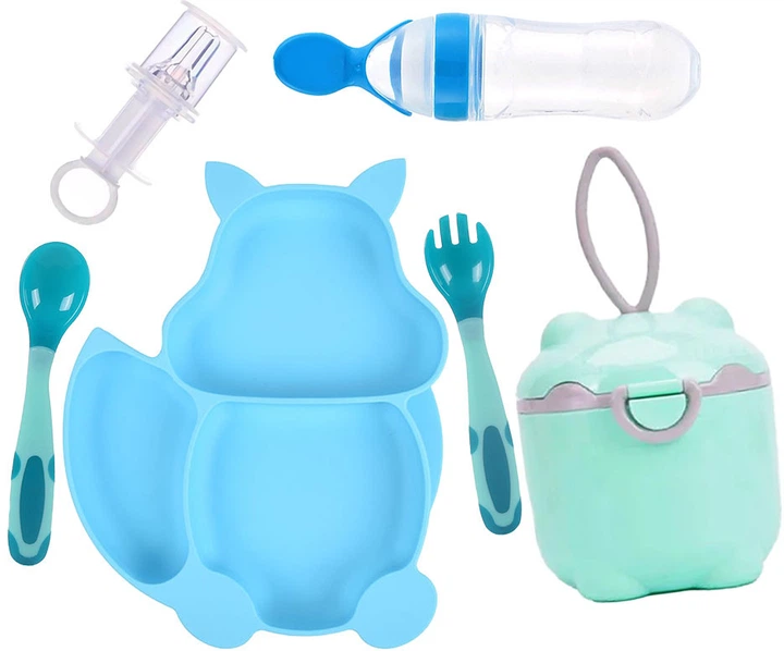 Набір Y9 силіконова тарілка, ложка, контейнери-снеки, шприц-дозатор, пляшка-ложка Блакитний (vol-10037)