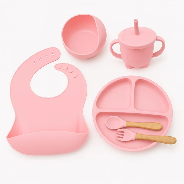 Набір дитячого посуду з 6 предметів силіконовий термостійкий рожевий
