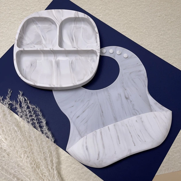 Секційна тарілка на присосці з нагрудником, 2 шт. Білий мармуровий