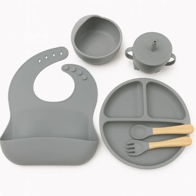 Набір дитячого посуду з 6 предметів силіконовий термостійкий сірий
