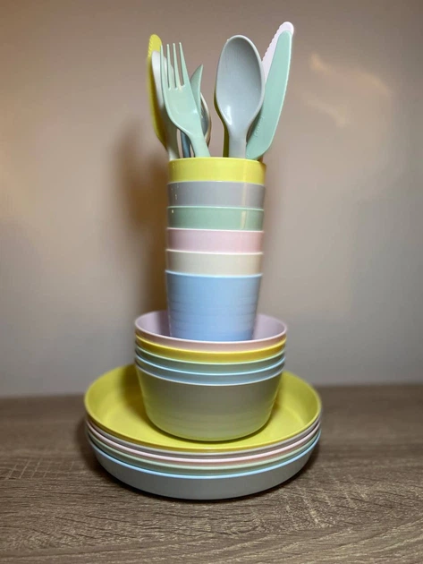 Набір дитячого посуду — ложки, виделки, ножі, склянки, тарілки та миски. Різні кольори Ikea