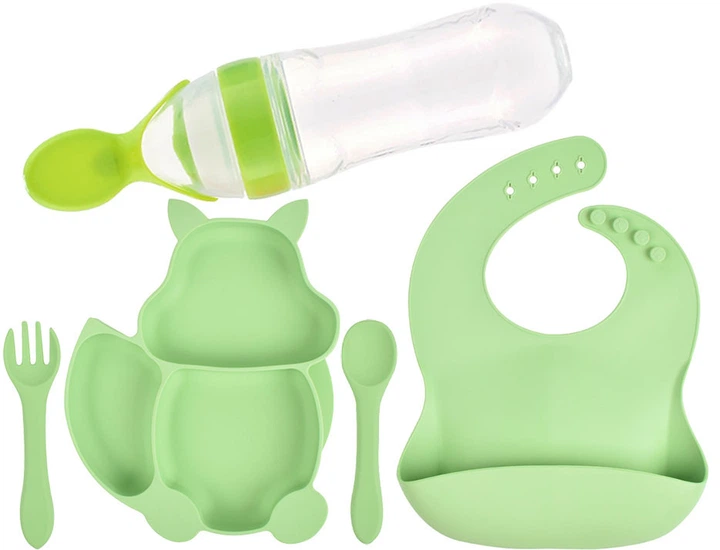 Набір силіконова секційна тарілка у формі білки слинявчик ложка вилка пляшка-ложка 2Life Y3 5 шт Зелений (vol-9930)