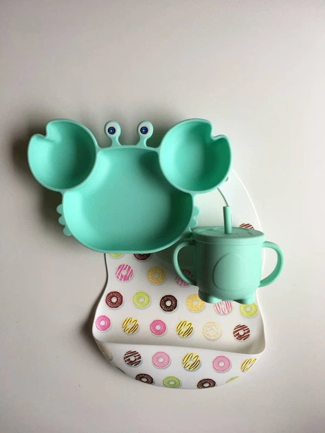 Набір дитячого посуду 3в1 м'ятний. Дитячийсиліконовий посуд для дітей: Краб, нагрудник, поїльник